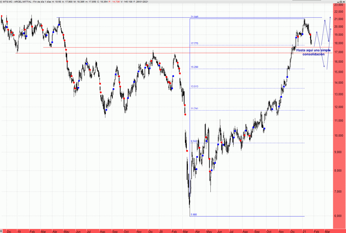 Su cotización ha encontrado freno a primeros de enero en el nivel de recuperación teórico del 61,8% de Fibonacci de toda la caída originada en los 30 euros hasta los 6 euros. Las caídas de las últimas sesiones encajan con una simple consolidación sobre primeros soportes, sobre los 17,70 euros, pero no nos sorprendería que corrigiera en mayor medida hacia la zona de los 15,30 euros, retroceso del 38,2% de todo el tramo alcista desde marzo. Eso sería lo que esperaríamos de cara a buscar una ventana de compra. El riesgo de ver esa caída adicional en lo que veríamos como una magnifica oportunidad de compra solo se alejaría si la presión alcista logra cerrar al menos sobre los 19,60 euros. Eso sería una señal de fortaleza que plantearía la posibilidad de estar ante una simple fase lateral consolidativa previa a más subidas.