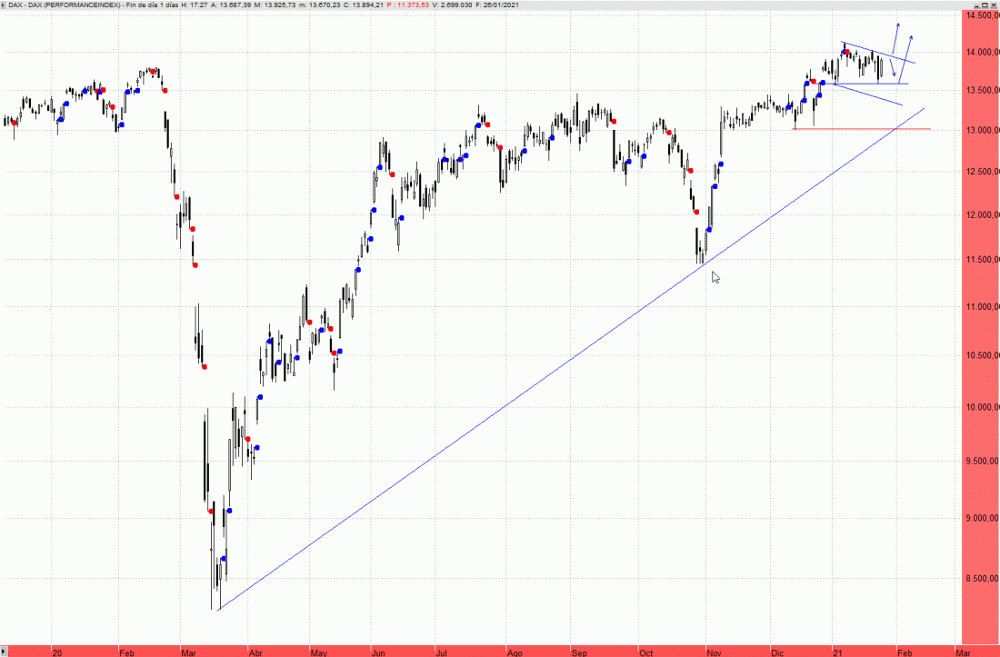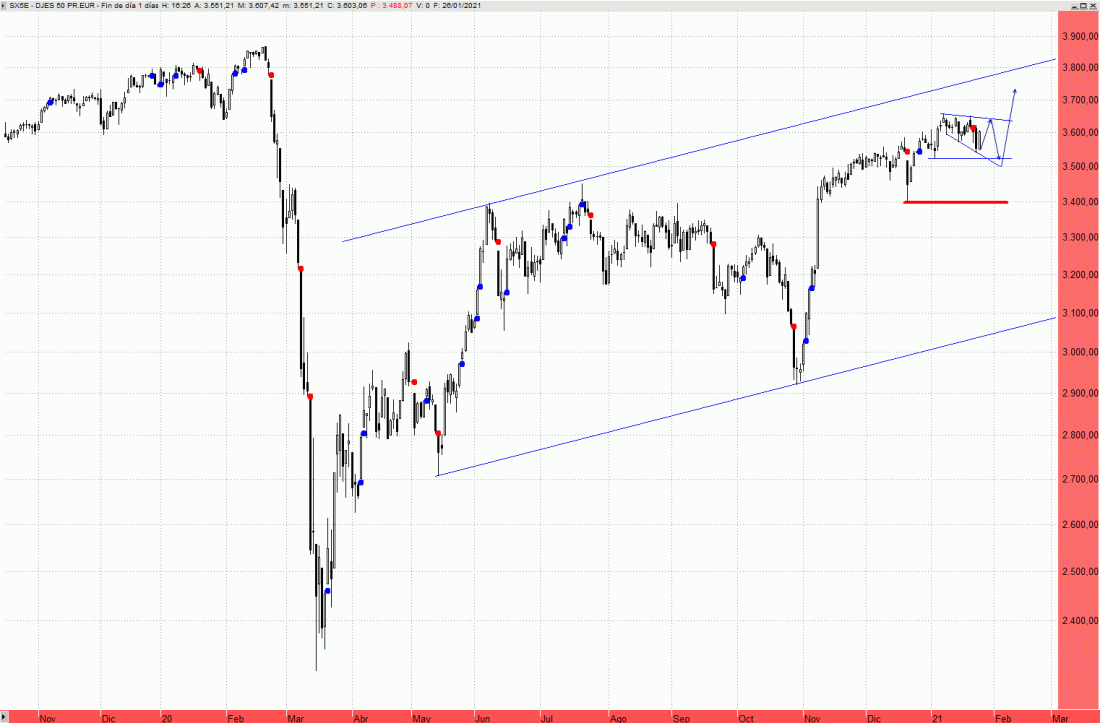 Ceder niveles como son los 3.524 puntos de Eurostoxx o los 13.587 puntos de Dax, desde donde la referencia alemana abrió un hueco a finales de diciembre que está funcionando como soporte, abriría la puerta a una corrección hacia los mínimos de diciembre. Hablamos de ver una vuelta hacia los 3.400 y los 13.000 puntos de Dax respectivamente, pero mientras estos primeros soportes sigan en pie la senda alcista sigue siendo la más probable a pesar de que pueda necesitar más sesiones para consolidar. Esta consolidación está sirviendo para aliviar la sobrecompra acumulada desde los mínimos de primeros de noviembre, desde donde se gestó el actual tramo alcista que, a pesar de las dificultades no damos por concluido.
