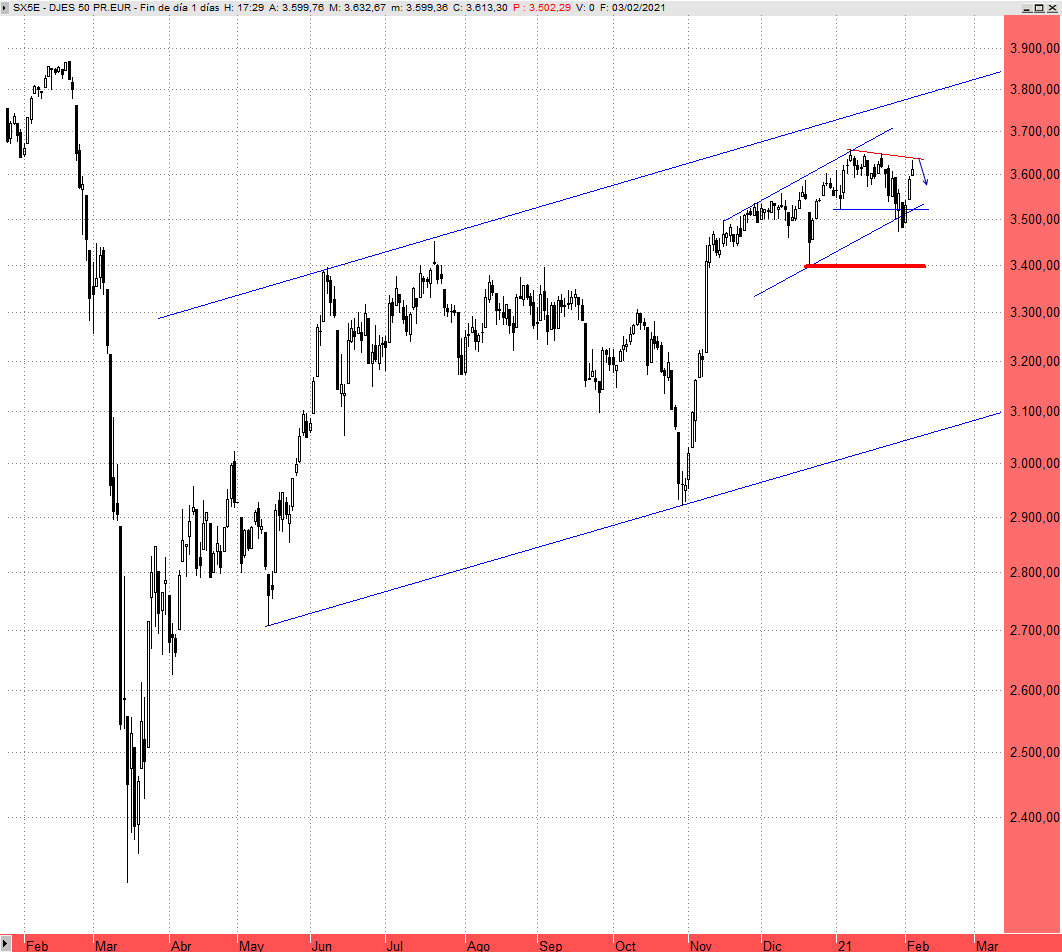 Para poder hablar de que se aleja el riesgo de ver una recaída a los mínimos de diciembre el Eurostoxx 50 debería de cerrar al menos el hueco abierto desde los 3.618 puntos.