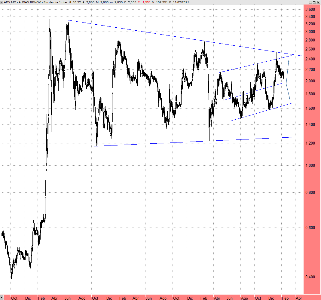 Audax Renovables no ha podido con la resistencia decreciente que aparece en la zona de los 2,60 euros y retrocede posiciones hacia la parte central del lateral con sesgo alcista que define en los últimos meses. De no reaccionar sobre la zona de los 1,94 euros mucho nos tememos que veremos más caídas hacia los 1,70 e incluso los 1,35/1,20, entorno de soporte fundamental que no debe de perder en ningún caso para seguir confiando en un escenario de reanudación alcista. Entendemos que es cuestión de tiempo que rompa al alza la fase lateral consolidativa que define desde primeros de 2019, pero no debería de sorprendernos que todavía necesite consumir bastante más tiempo con sucesivos vaivenes.