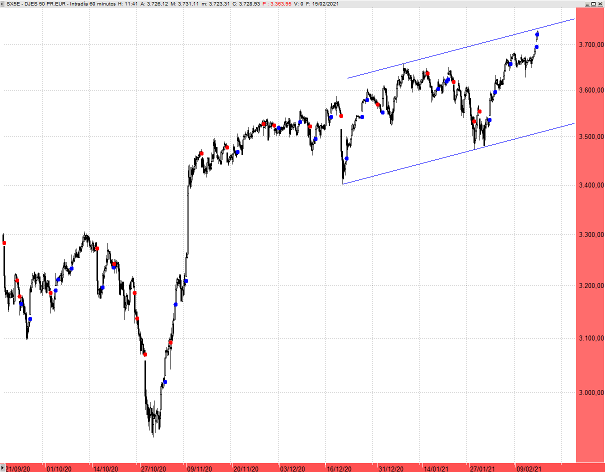 El Eurostoxx 50 presiona el techo del canal lateral con sesgo alcista que discurre por la zona de los 3.730/3.745 puntos, que es el primer objetivo de corto plazo que hemos venido señalando en las últimas semanas. Su superación abriría la puerta a más subidas hacia el origen del Covid-Crash, hacia los 3.867 puntos.