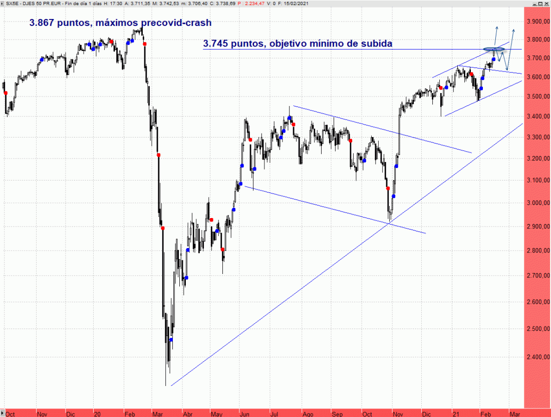 Subidas en las bolsas europeas que han abierto un hueco alcista aprovechando la festividad de Wall Street por el Día de los Presidentes. Lo más destacable es que el Eurostoxx 50 alcanza el primer objetivo que veníamos señalando en sesiones previas, la zona de los 3.730/3.745 puntos. Su superación abriría la puerta a más subidas hacia el origen del Covid-Crash, hacia los 3.867 puntos.