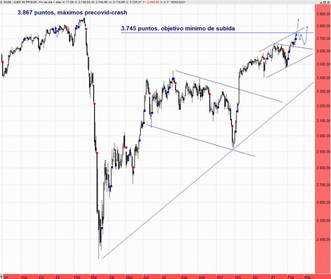 La cuestión ahora es ver si encuentran presión alcista suficiente para que el Eurostoxx 50 pueda seguir avanzando hacia el origen del Covid-Crash, hacia los 3.867 puntos, y el Dax 30 hacia la resistencia creciente que discurre por los 15.000 puntos.
