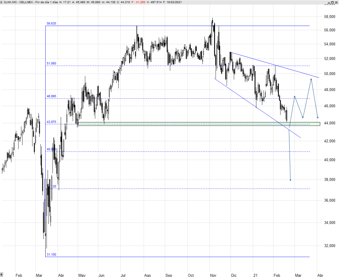 Situación complicada para Cellnex, uno de los títulos que ha venido mostrando más fortaleza en los últimos años en la renta variable española. Está perdiendo momento alcista y se aproxima a la zona de soporte de los 44 euros, el origen del último segmento alcista destacable en su tendencia alcista. Este entorno representa además aproximadamente la mitad de la subida originada desde los 31 euros.