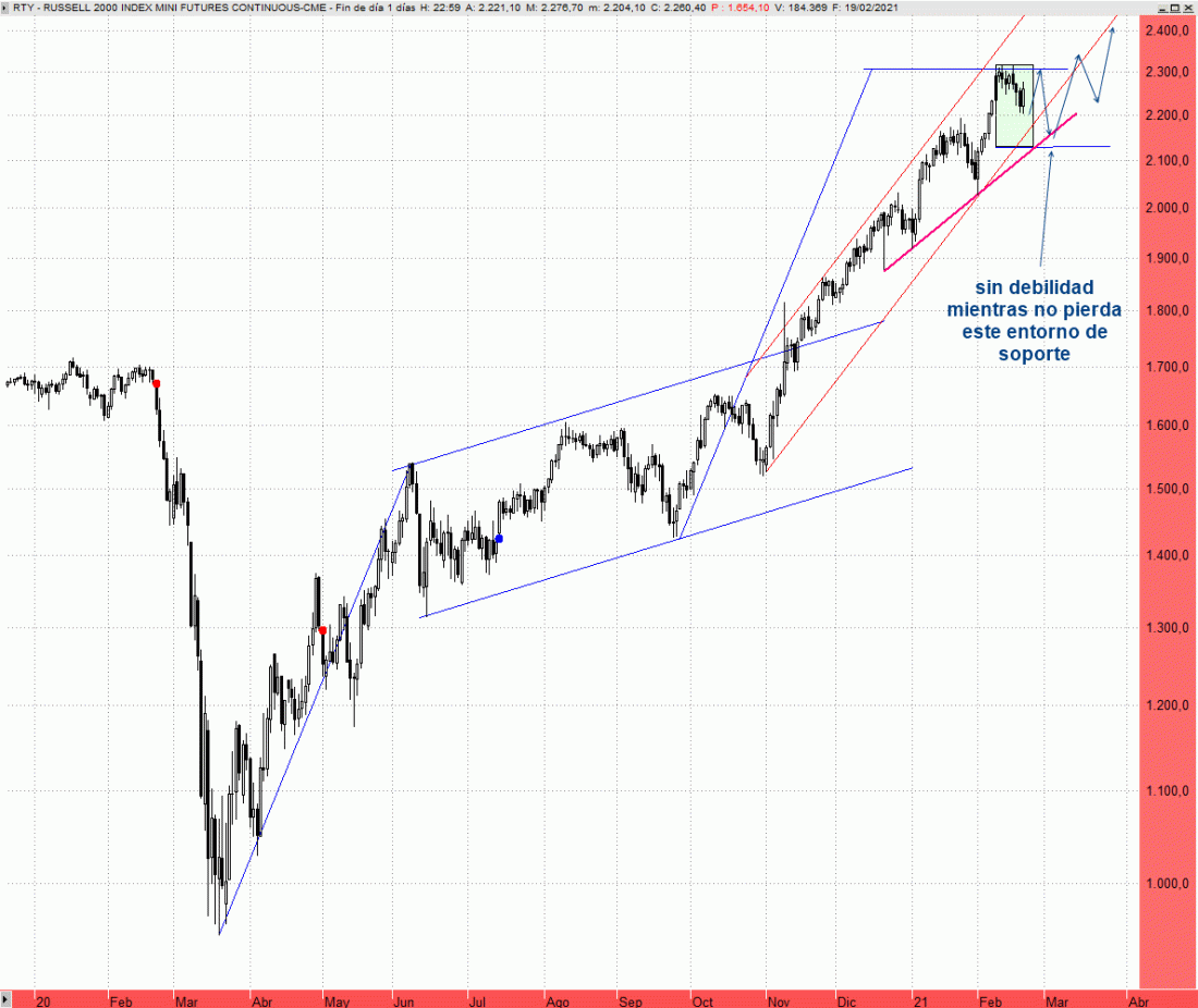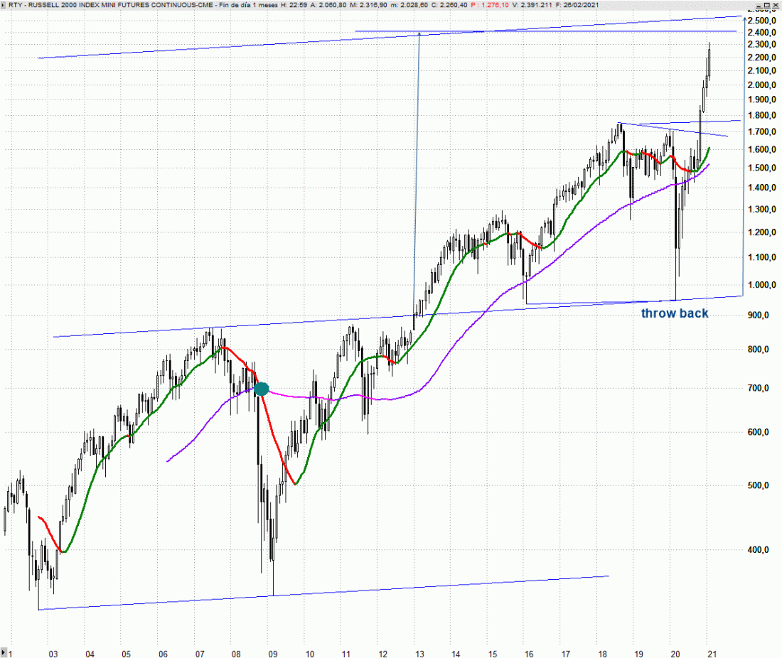 A plazos largos cabe destacar en el Russell 2000 que se aproxima al gran objetivo teórico que surge de extender la amplitud del gran giro en forma de doble suelo que protagonizo en la primera década de siglo. Concretamente hablamos de los 2.400 puntos, o incluso dilatando las subidas hacia el techo del canal desdoblado que mostramos en el chart adjunto podrían extenderse hacia los 2.500 puntos.