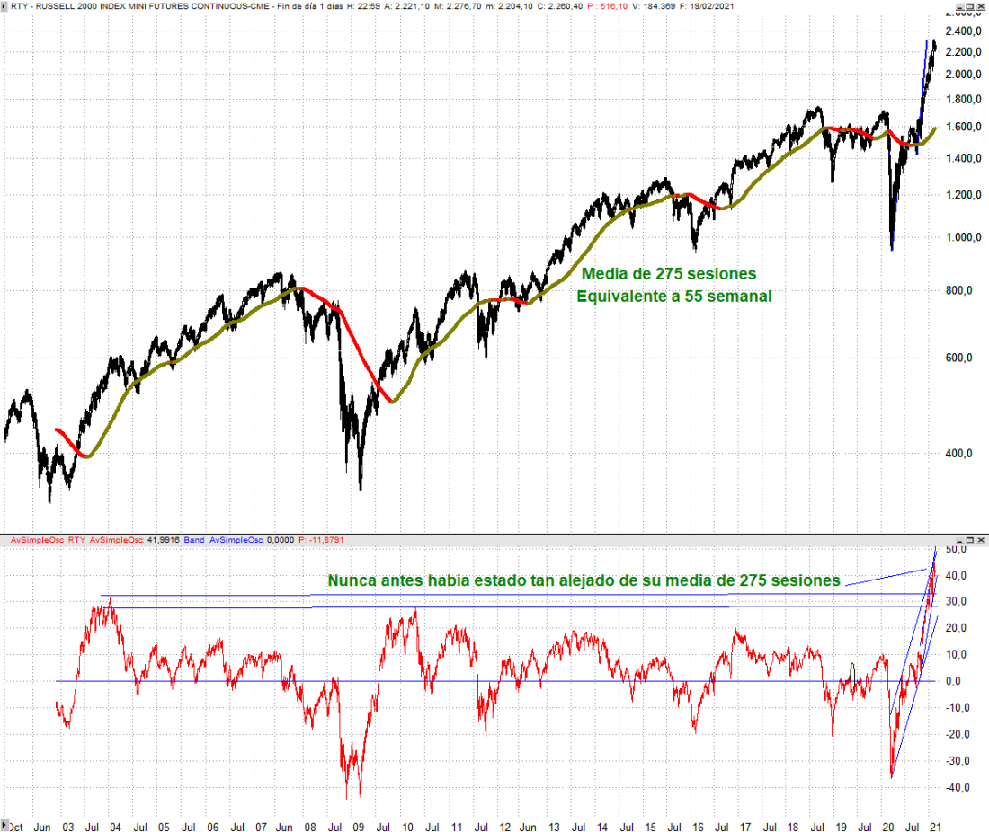 Atendiendo al diferencial de una media de 275 periodos con respecto de su cotización en gráfico diario, equivalente a la media de 55 periodos en semanal, nunca antes había estado tan sobrecomprado en precio. Se encuentra distanciado un 42%, por lo que es ya un claro hándicap a tener en cuenta en el corto y medio plazo, pero no deja de ser un gran signo de fortaleza que sugiere que cuando concluya el actual tramo alcista y corrija una parte significativa estaremos ante una gran oportunidad para comprar. Suele ser propio del primer tramo de una gran reconstrucción que se aleje tanto de su media, por tanto, es algo muy halagüeño para años venideros.