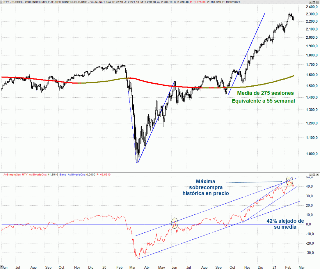 El Russell 2000 está pasando desapercibido a la sombra de los índices tecnológicos, pero desde los mínimos de marzo pasado, hace prácticamente un año, se ha revalorizado nada menos que un 140%. El Nasdaq 100 que acapara más titulares lo ha hecho precisamente en un 100% desde mínimo a máximo de la actual subida.