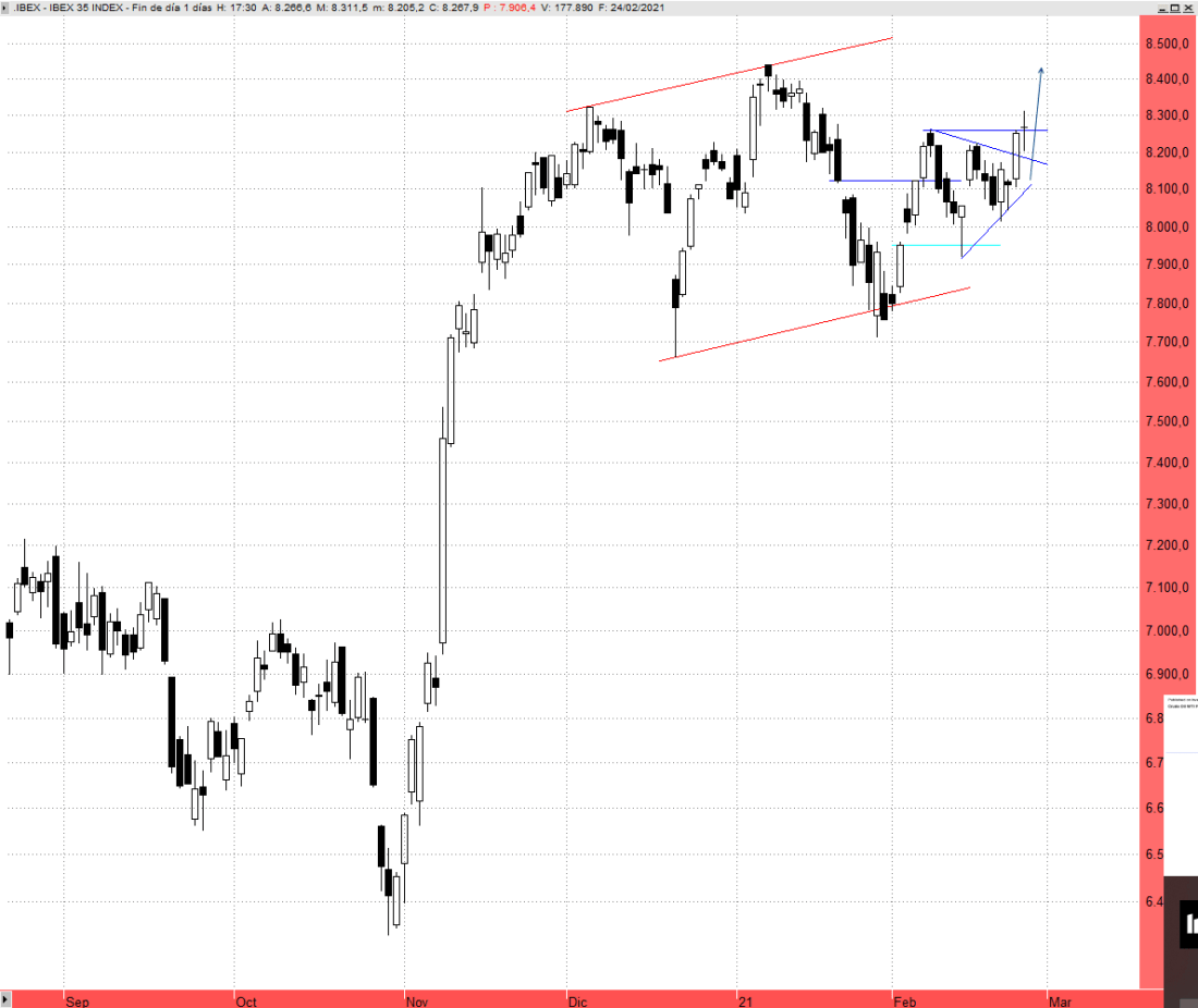 El selectivo español Ibex 35, que ayer protagonizó un interesante movimiento alcista en una sesión teñida de rojo, confirma hoy la superación de los 8.260 puntos. No es algo definitivo para confiar en su reanudación alcista, pero si aleja los riesgos de ver una corrección más profunda. Por tanto, refuerza un escenario en el que es cuestión de tiempo para que marque máximos crecientes sobre los 8.440 puntos.