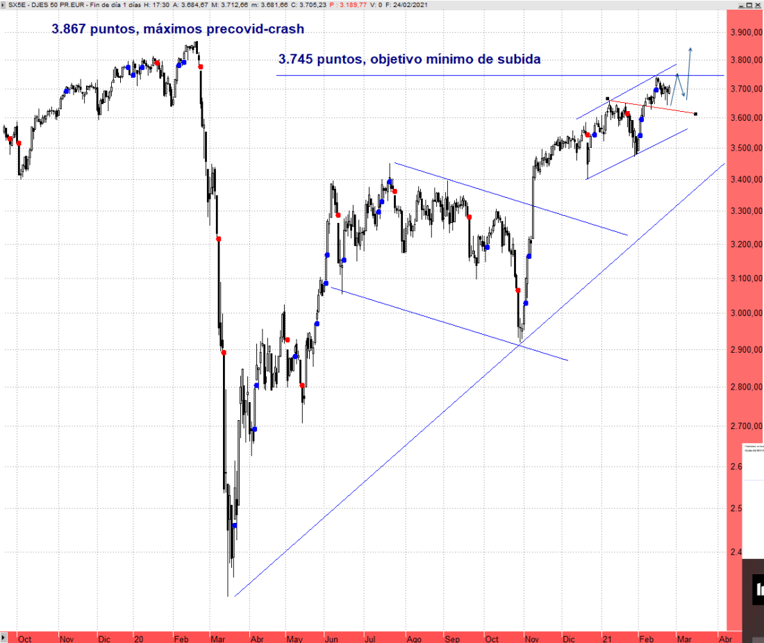 En términos generales los principales índices de referencia consolidan la vela blanca de cuerpo amplio formada hace dos semanas. No nos sorprende que el Eurostoxx 50 haya encontrado freno en los 3.745 puntos, el primer objetivo que veníamos señalando en sesiones previas, y que el Dax 30 alemán siga encontrando dificultades en su zona de máximos históricos. La cuestión ahora es ver si las bolsas europeas encuentran presión alcista suficiente para que el Eurostoxx 50 pueda seguir avanzando hacia el origen del Covid-Crash, hacia los 3.867 puntos, y el Dax 30 hacia la resistencia creciente que discurre por los 15.000 puntos.