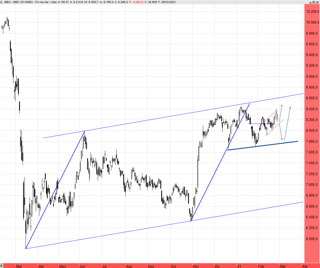 Para alejar el riesgo de ver una corrección más profunda debe de cerrar el hueco abierto desde los niveles de cierre de ayer, desde los 8.317 puntos. Hasta el momento, lo visto en apertura podría ser considerado como un simple throw back hacia resistencias superadas, ahora soportes. Mientras no pierda la directriz que discurre por los 8.130 puntos mantiene sus opciones de seguir avanzando en busca de marcar máximos crecientes sobre los 8.440 puntos.