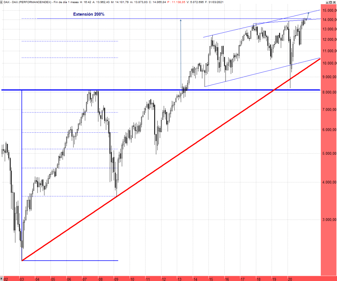 Cabe destacar, además, como curiosidad, que el Dax 30 alemán está encontrando freno en la extensión del 200% en puntos, no porcentualmente, de la amplitud del gran giro alcista confirmado sobre los máximos de 2007. En términos porcentuales su extensión plantea subidas hacia los 30.300 puntos, lo que lógicamente llevará su tiempo. Con todo, la corrección del pasado año encaja con un simple throw back a resistencias superadas, ahora soportes, para seguir ascendiendo con sus correspondientes correcciones o altos en el camino.