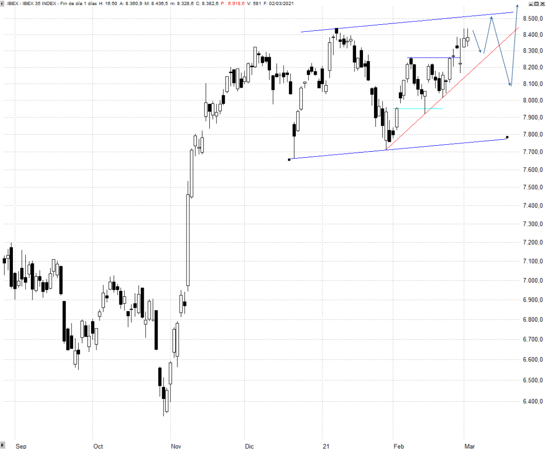 El selectivo español Ibex 35 está mostrando fortaleza relativa a corto plazo y mientras se mantenga sobre los 8.190 puntos, por donde discurre la directriz de aceleración que guía los últimos avances desde finales de enero, no dará ninguna muestra debilidad que ponga en jaque su continuidad alcista. Superando los 8.490 puntos alejaría en mayor medida los riesgos de ver una corrección más profunda por debajo de los 7.700 puntos.