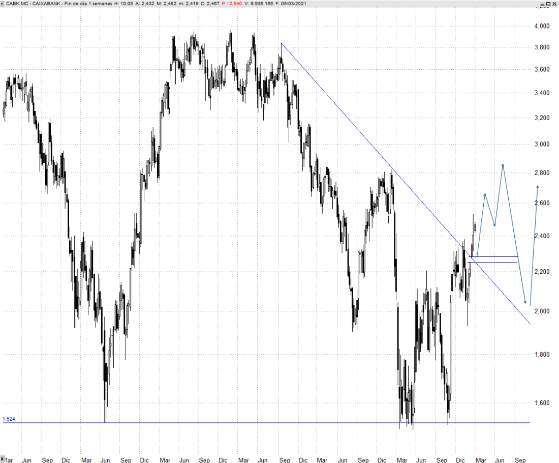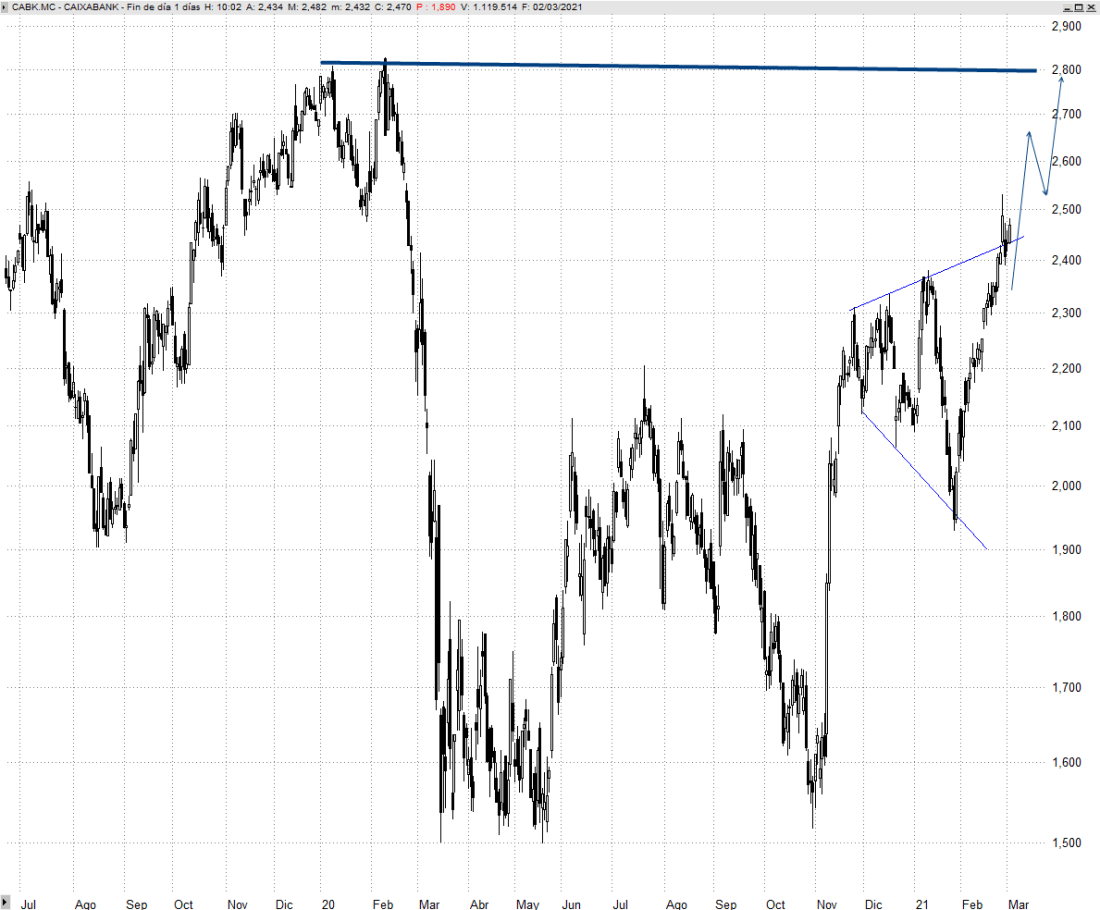 Caixabank ha confirmado en los últimos meses un doble suelo sobre los 2,20 euros desde la zona de mínimos que también freno las caídas en 2016. Tras varias semanas corrigiendo de forma triangular expansiva, ha marcado máximos crecientes y se dispone a seguir avanzando hacia los 2,80 euros, el origen del desplome provocado por la pandemia. Esa es la resistencia a batir para que gane enteros una amplia reestructuración alcista.