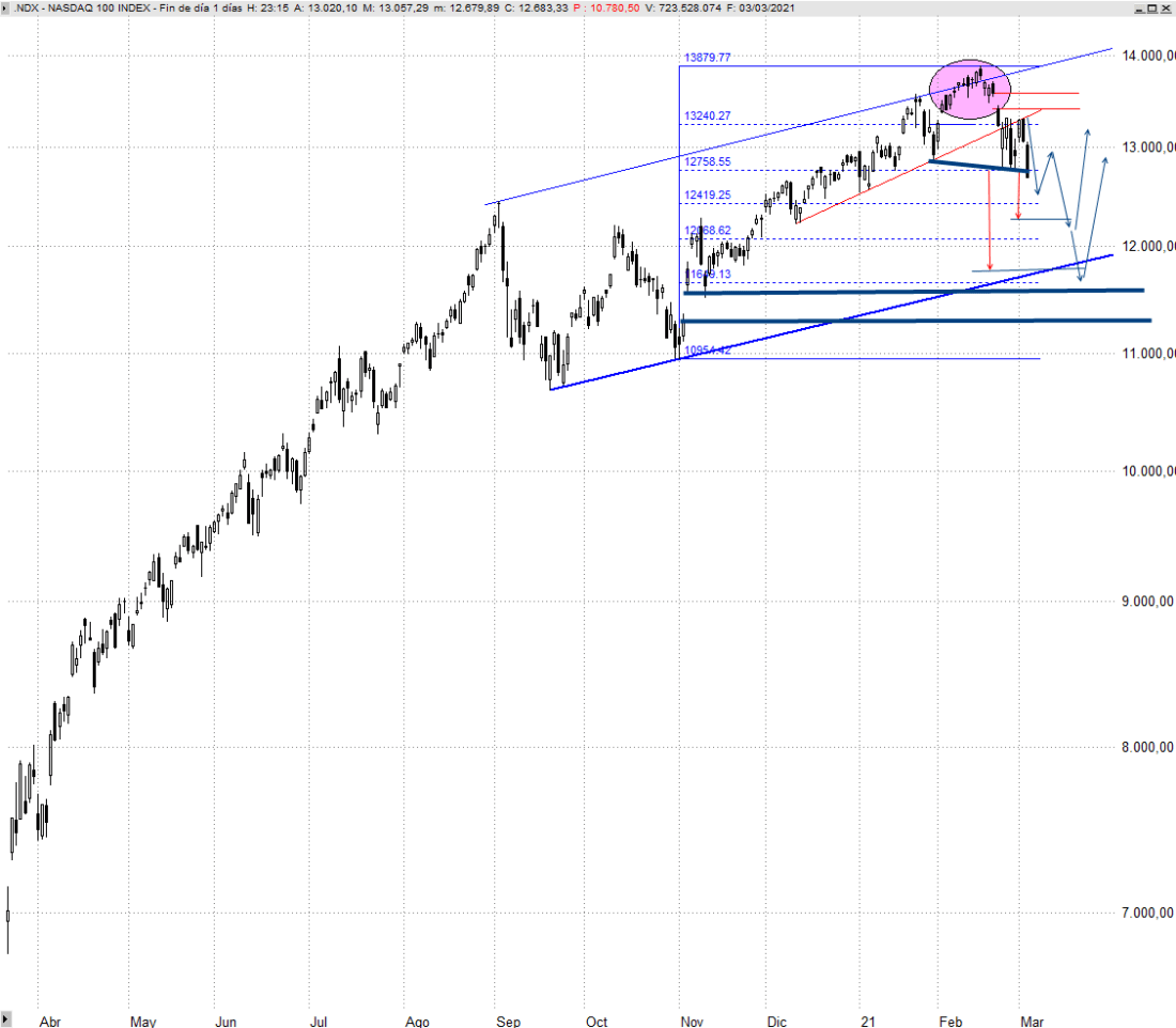 De momento estamos asistiendo a una corrección de orden menor que está purgando los excesos de meses pasados, pero la pérdida de los 12.760 puntos de Nasdaq 100 plantea caídas que podrían dirigirse al menos hacia los 12.220 puntos, caídas adicionales del 3,5% desde los niveles de cierre de ayer, o incluso hasta los 11.635 puntos si extendemos el giro bajista que ha tomado cuerpo en forma de cabeza y hombros. Esta segunda opción llevaría su cotización a poner a prueba peligrosamente la base del canal que mostramos en el chart diario adjunto, cuya cesión no sería para nada una buena noticia para sus aspiraciones de continuidad alcista.