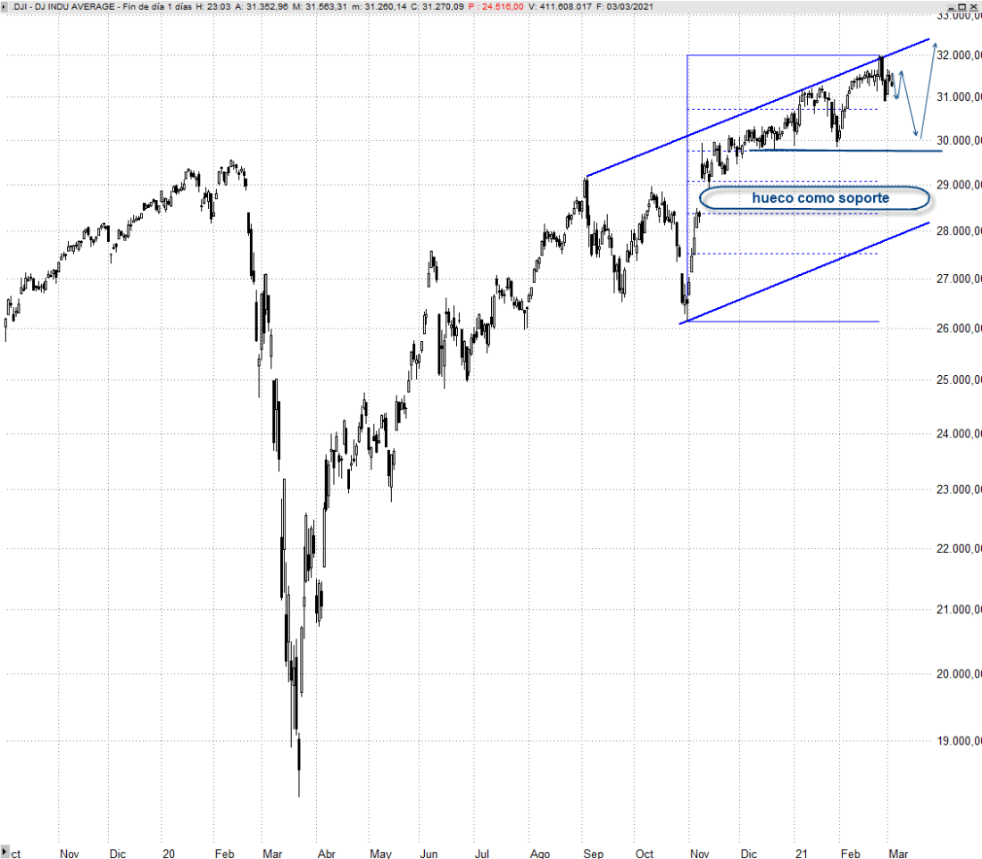 Por el momento no hablamos de corrección de orden mayor y no nos sorprendería que una vez que concluya esta fase de ajuste podamos ver subidas en el Dow Jones Industriales hacia la zona de los 34.000 puntos como último segmento alcista destacable antes de corregir en mayor medida.