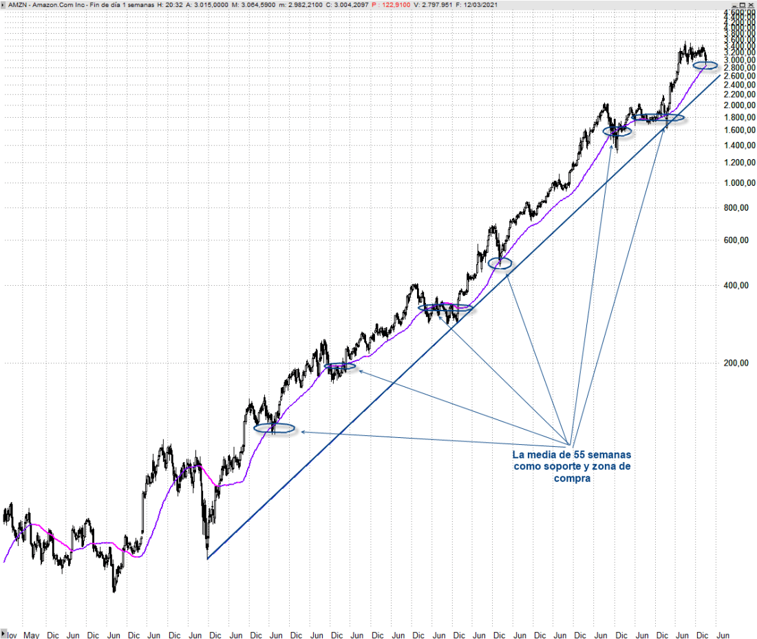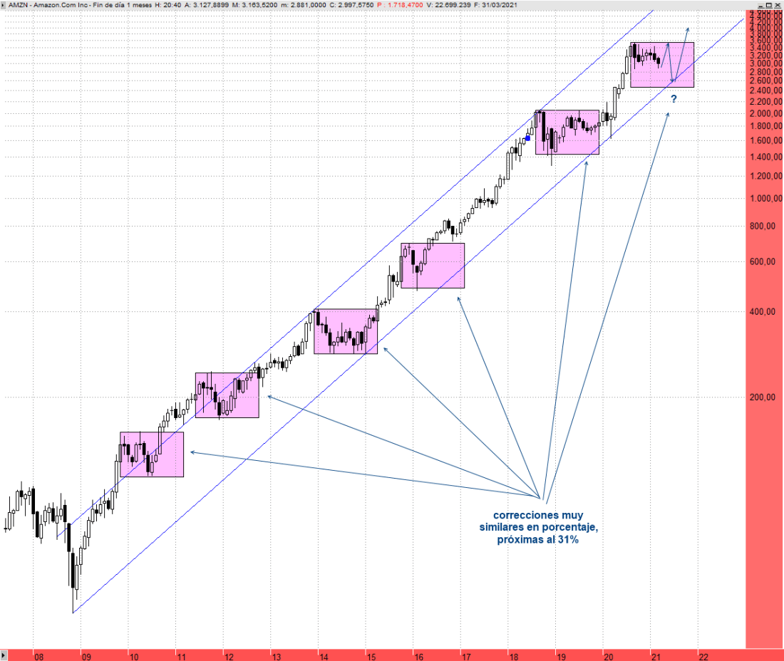 Si observamos las correcciones en Amazon desde el suelo formado en 2008 han venido rondando el 31%. Ya ha corregido aproximadamente un 20% desde los 3.552 dólares a los 2.871, mínimos de septiembre. Si no logra marcar máximos crecientes no descartaría que acabe corrigiendo en mayor medida hacia los 2.470 dólares, hacia la directriz ascendente de largo plazo que mostramos en el chart adjunto, lo que sería una inmejorable oportunidad para comprar con vocación de permanencia, pero a corto plazo lo más probable es que veamos un rebote significativo, del orden del 20% desde los niveles actuales. Tomaría cuerpo si recupera a cierre de una sesión los 3.058 dólares.