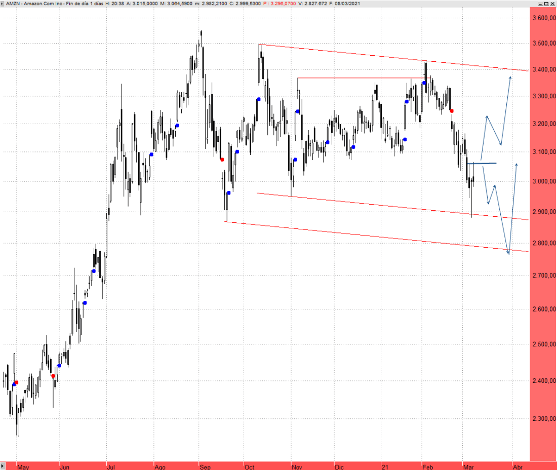 Amazon ha perdido momento alcista en los últimos meses. Desde septiembre no logra marcar nuevos máximos crecientes y a primeros de febrero asistimos a un fallo alcista tras superar eventualmente la resistencia intermedia de los 3.367 dólares. Desarrolla una fase lateral correctiva que ha llevado su cotización a niveles interesantes.