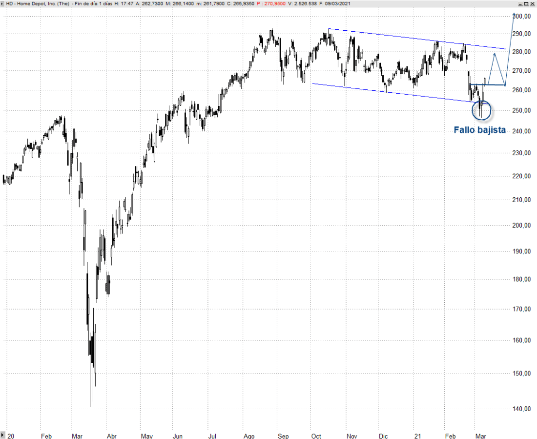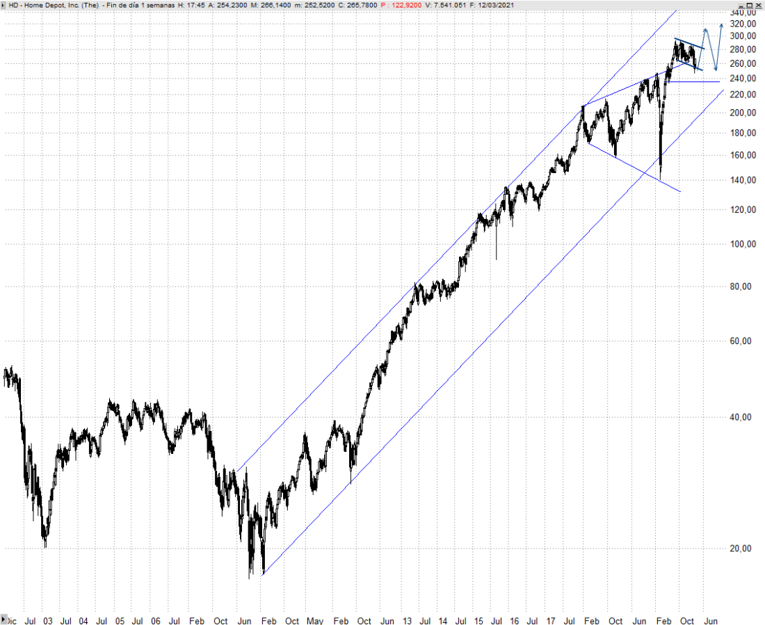 Sorprende la verticalidad de la recuperación de un título tradicional como Home Depot desde los mínimos del pasado año. La minorista ofrece servicios y productos para el hogar y opera 2.293 tiendas, además de venta en línea.