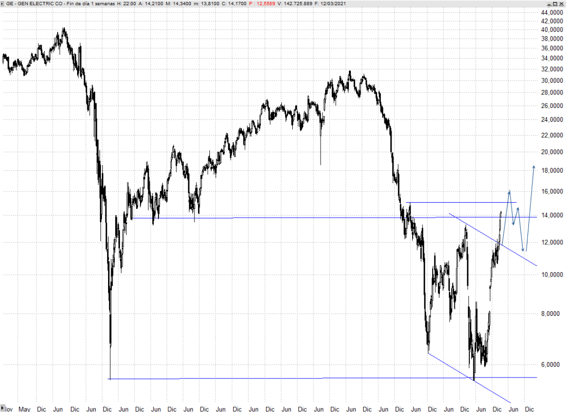 General Electric registra una espectacular subida desde los mínimos del pasado año, también mínimos del año 2009, con una revalorización superior al 160%. Es un título bajista a plazos largos que trata de formar un suelo sostenible y ya ha confirmado un amplio giro tras superar la barrera de los 12 dólares.