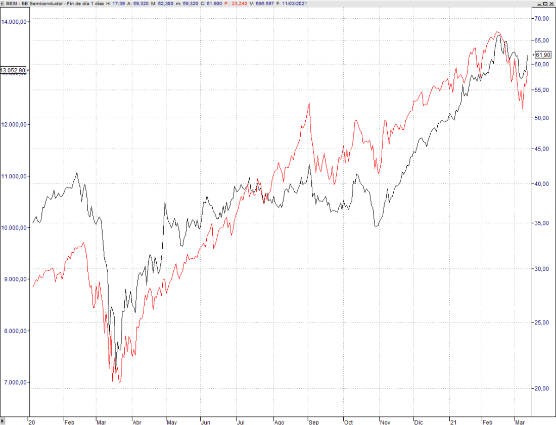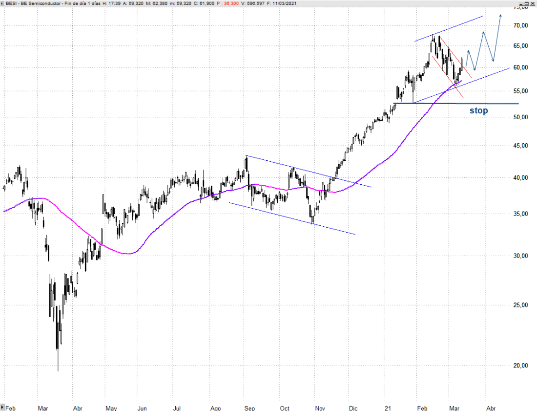 Operativamente podría esperarse una vuelta atrás hacia los 58,65 euros para comprar con stop bajo los 52. Sería un stop razonable para subir a su tendencia. No es momento para la complacencia, pero tampoco para ponerle techo a las subidas a pesar de que los principales índices de referencia europeos se enfrentan a resistencia importantes que podría ser un lastre para BESI. En todo caso, es un título que guarda más correlación con el índice tecnológico Nasdaq 100 que con la bolsa europea. Ayer el Nasdaq 100 cerró presionando los 13.060 puntos, que es lo que venimos exigiendo desde Trader 35 para considerar que estamos ante su reanudación alcista, por lo que su confirmación sería un argumento adicional para plantearse tomar posiciones en Besi.