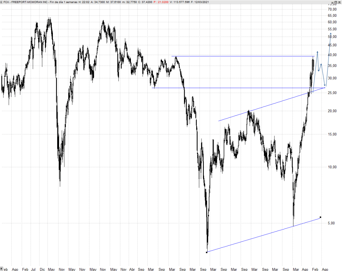 • Freeport-McMoRan, que presiona una importantísima resistencia en su reconstrucción alcista y nos sorprendería que extendiese las subidas hasta los 42 dólares antes de corregir.