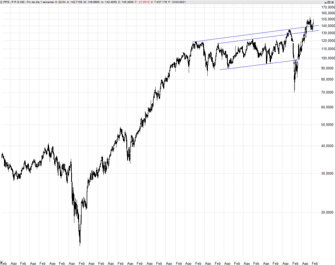 • PPG Industries, consolidando en máximos históricos, lo que invita a esperar una corrección más amplia para buscar subir a su tendencia.