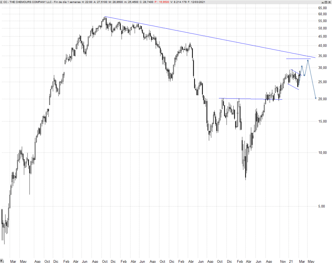 • The Chemours Company, que está superando su fase consolidativa y a punta a más subidas hacia los 33,80 dólares.