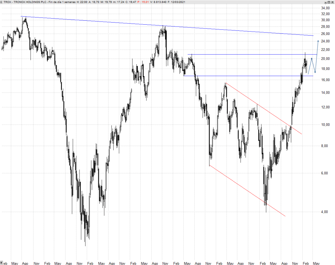 • Tronox Holdings, que consolida por debajo de la resistencia intermedia de los 21 dólares. Mientras no pierda los 15,50 tiene en el punto de mira los 26 dólares.