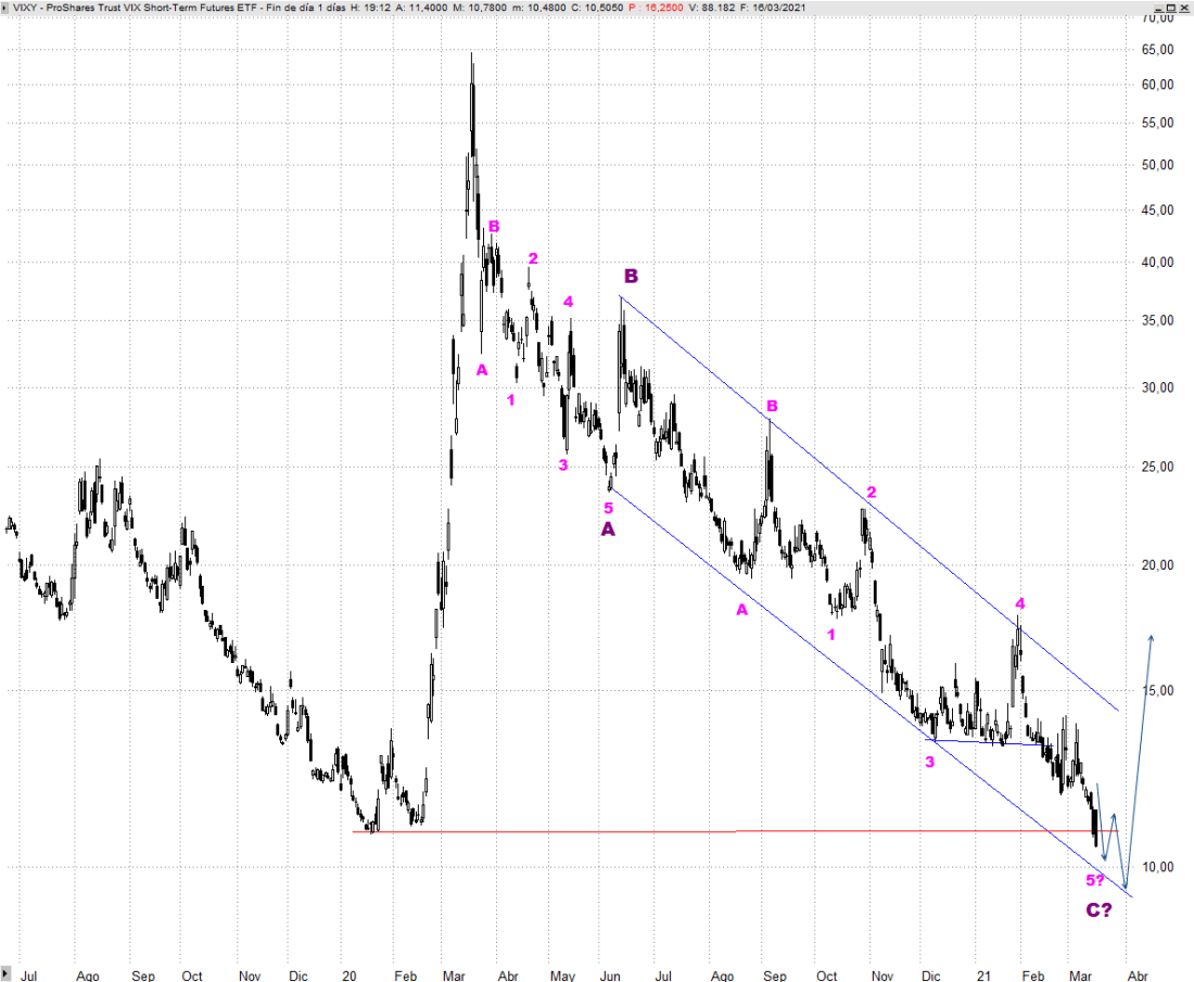 No perdemos de vista el comportamiento del ETF de volatilidad VIXY, que entendemos se encuentra desarrollando su último segmento a la baja. Mientras se mantenga por debajo de los 13,90 dólares no deberíamos de preocuparnos por las bolsas, pero si rompe al alza podría ser la primera pista de que el proceso alcista originado en marzo del pasado año ha concluido y necesita ser corregido. Ya alcanza niveles de soporte objetivo, por lo que estrechamos su vigilancia.