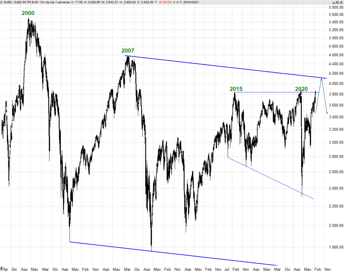 Tanto el índice SX7P Stoxx 600 Banks como el índice SX7E Stoxx Banks podrían tener aún un segmento potencial de subida en próximas sesiones sobre la directriz decreciente que están superando de aproximadamente el 7% hasta los 135 y los 94,60 puntos respectivamente. Eso favorecería que el Eurostoxx 50 logre batir definitivamente el entorno resistivo que está poniendo freno a las subidas, los 3.867 puntos, máximos previos al Covid-Crash, entorno que también puso freno a las subidas en 2015, por lo que es una resistencia doblemente importante.
