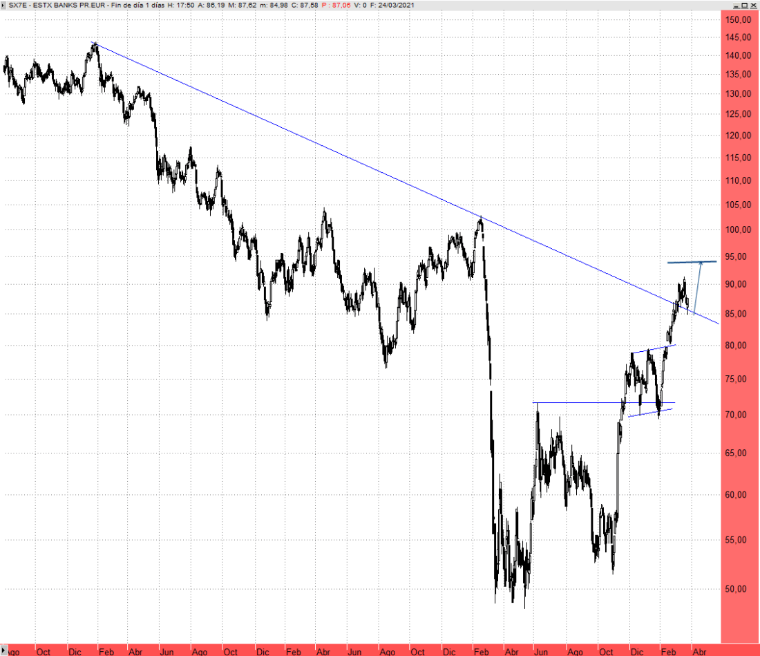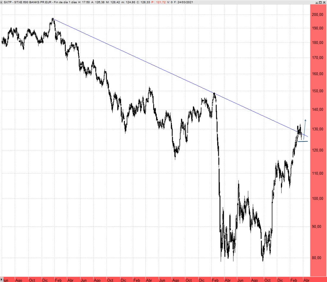 No obstante, mientras los 12.700 puntos de Nasdaq 100 sigan en pie los alcistas están al mando y no debemos dar por perdido el soporte. La tendencia originada en marzo del pasado año sigue viva y las bolsas europeas, que consolidan tranquilamente posiciones en las últimas sesiones tras el cuádruple vencimiento de derivados del pasado viernes, cuentan con un aliado en el sector bancario. Este sector ha sido muy castigado en los últimos años, pero a corto plazo aún puede tener subida antes de que necesite corregir parte de las ganancias que acumula en los últimos meses.