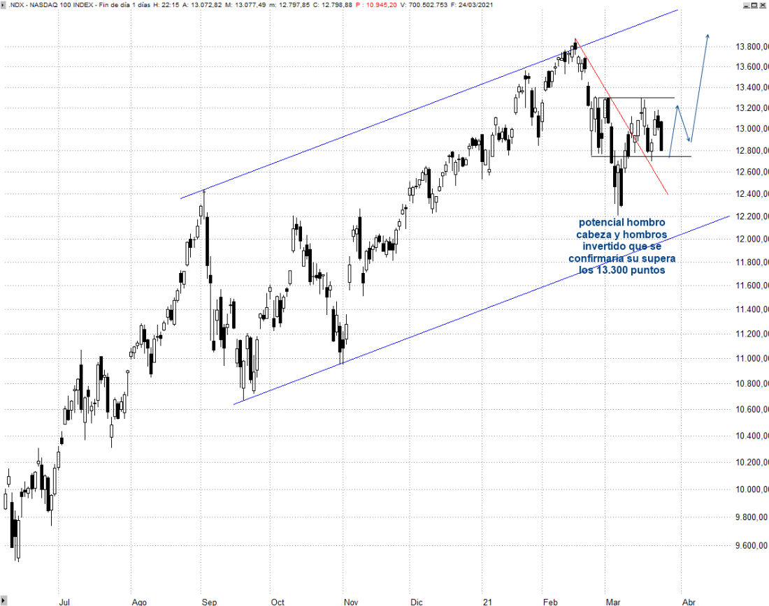 Las bolsas europeas no pierden de vista lo que acontece en Wall Street. En concreto a corto plazo el comportamiento del Nasdaq 100, que se debate entre los 13.300 y los 12.700 puntos. Al cierre de la sesión de ayer se aproximó a la parte inferior del rango, cuya cesión sería una mala noticia para las bolsas europeas, puesto que eso abriría la puerta a caídas del orden del 5-6%. Pondría probablemente a prueba la base del canal ascendente que define en los últimos meses. Los 11.900 puntos es lo que en ningún caso debe de perder para no hablar de una corrección de mayor calado de parte de las subidas originadas en marzo.