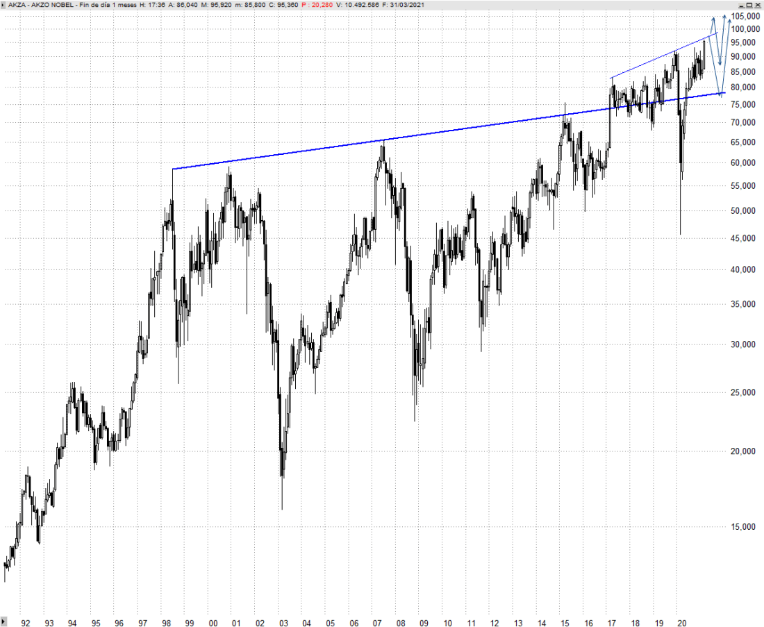 La pandemia truncó una enorme formación de giro sobre los máximos ligeramente crecientes de los últimos 22 años, truncó su subida libre absoluta. La potente recuperación a la que estamos asistiendo en los últimos meses nos habla de su fortaleza de fondo e invita a mantener en vigilancia su comportamiento de cara a buscar entrada con vocación de largo plazo, en aras de aprovechar, esta vez sí, la subida libre absoluta truncada el pasado año por el Covid-Crash.