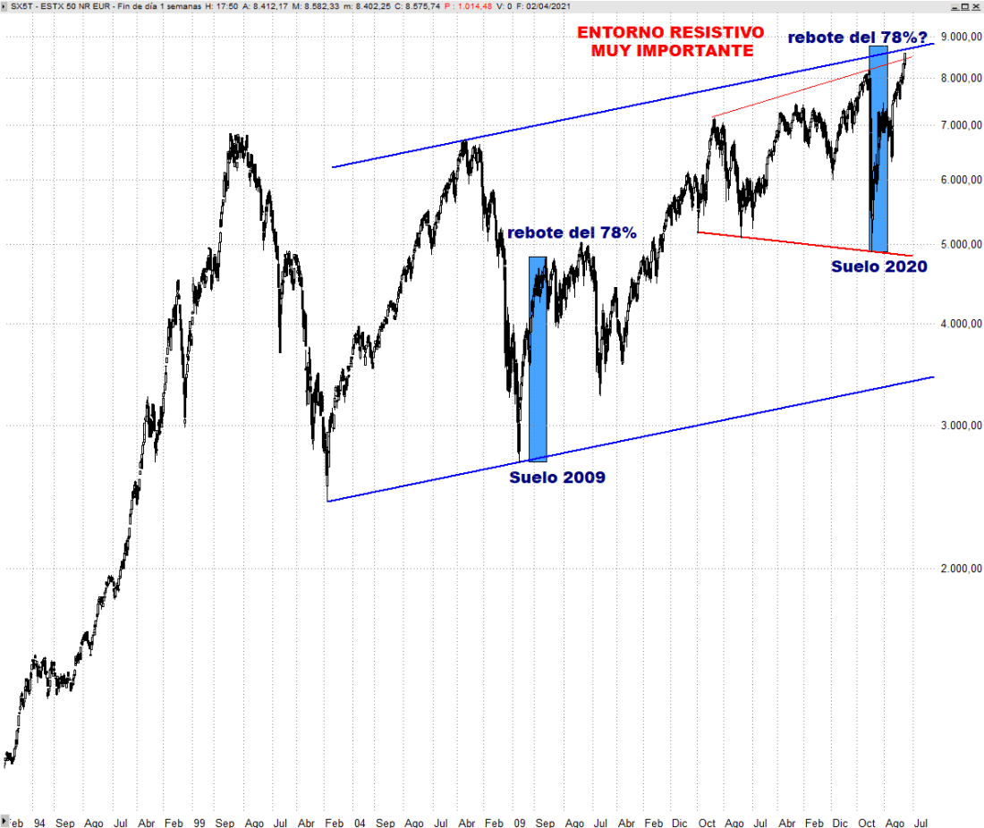 Prácticamente un año y un mes después del crash bursátil provocado por el estallido del Covid, el Eurostoxx 50 ha logrado superar con claridad los máximos previos, los 3.867 puntos, algo en lo que hemos venido insistiendo desde Trader 35 que era cuestión de tiempo que sucediera. Este entorno resistivo era doblemente importante, puesto que puso freno también a las subidas en 2015. Su superación, la consecución de un máximo creciente a cierre mensual y trimestral, nos otorga un argumento añadido para ser optimistas de cara a próximos años. Es una invitación a comprar aprovechando futuras correcciones para subir a una tendencia que podría no haber hecho más que empezar. El siguiente nivel a recuperar, los máximos del año 2007, se encuentra a un 16% de distancia. Hablamos de los 4.572 puntos, que también será cuestión de tiempo para que sean alcanzados. No descartamos que lo pueda hacer sin antes corregir de una forma significativa, pero no será nada fácil. Hemos venido señalando un objetivo a corto y medio plazo en la zona de los 4.095 puntos, que se encuentran a un 4% de distancia. ¡Veremos si encuentra presión alcista suficiente para alcanzarlos y superarlos! ¿Quién sabe….? Mientras no pierda los 3.832/3.784 puntos no habrá debilidad destacable. Su cesión nos advertiría de agotamiento comprador y de que una corrección podría estar en marcha, pero mientras eso no suceda los alcistas mantendrán al control.