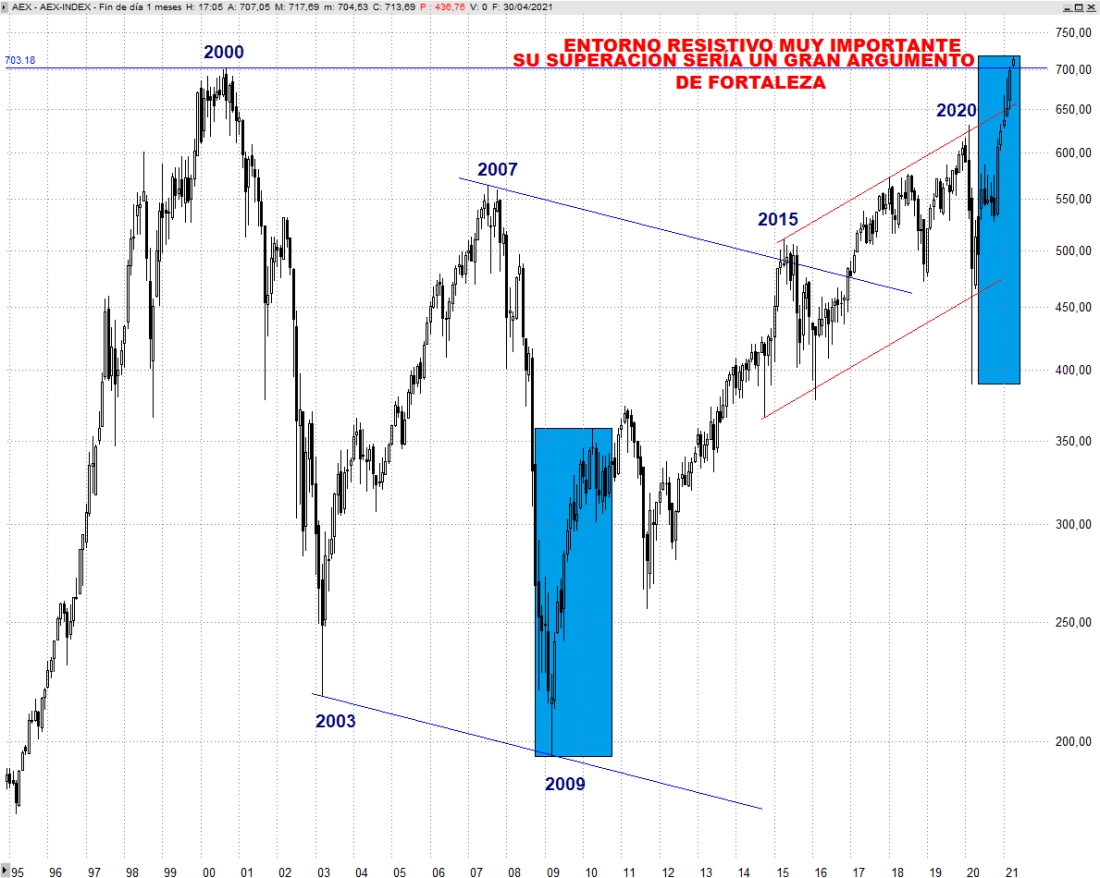 Cabe destacar también que el Eurostoxx 600, junto con el Cac 40 francés, han logrado hoy también recuperar los niveles previos al Covid-Crash. El AEX holándes, por su parte, lo que recupera son los máximos del año 2000, por lo que seguimos añadiendo argumentos de fortaleza para confiar en mayores subidas de cara al largo plazo. Vean también como el AEX ha alcanzado también a día de hoy el objetivo que surge de proyectar el mismo primer tramo alcista que desarrolló tras el suelo de 2009 (rectángulo azul, igual que el Eurostoxx 50).