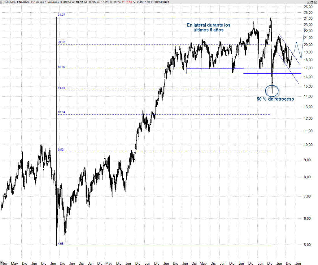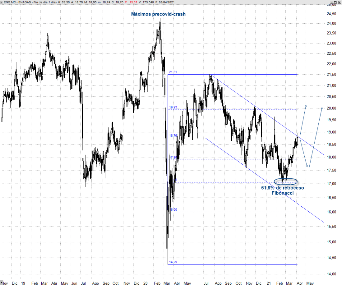 Enagás, referente internacional en el desarrollo, mantenimiento y operación de infraestructuras gasistas con presencia en 8 países, presiona el techo del canal lateral bajista que acota la corrección que viene desarrollando en los últimos meses.