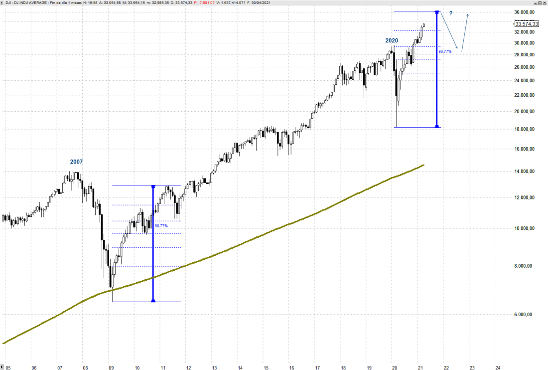 Tras el crash de 2007 el Dow Jones protagonizó un primer gran rally en su reestructuración de aproximadamente el 99%. Posteriormente asistimos a una corrección de un 19% que encontró suelo en el 38,2% de retroceso de Fibonacci. Después vino una gran tendencia alcista toda la década.