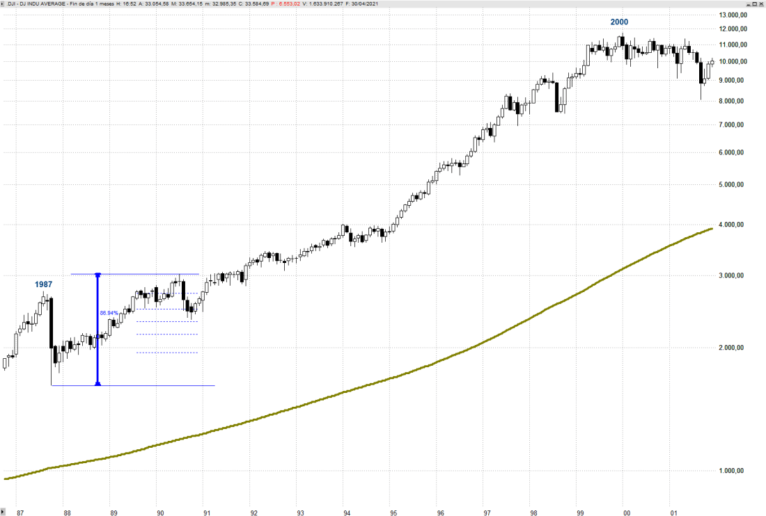 Tras el crash de 1987 el Dow Jones protagonizó, aunque en más tiempo, un rally hasta marcar nuevos máximos históricos de aproximadamente el 87%. Posteriormente asistimos a una corrección de un 22% que encontró suelo entre el 38,2% y 50% de retroceso de Fibonacci. Después vino una gran tendencia alcista toda la década.