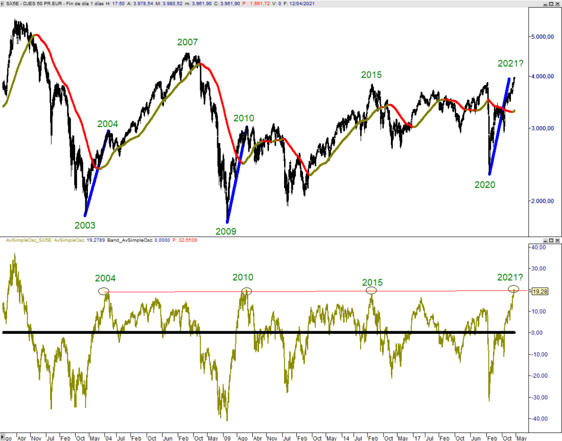 Si trasladamos la actual subida al suelo de 2009 observamos que ya ha desarrollado un tramo proporcionalmente idéntico al que desplegó entonces (rectángulo azul). Este hecho nos advierte de que hay que ser fiel a la tendencia mientras no haya evidencias de debilidad, pero que no hay que dejarse llevar tras los precios y comprar en demasía, puesto que sería del todo normal asistir próximamente a una corrección de parte de la subida originada en el suelo formado en marzo del pasado año.