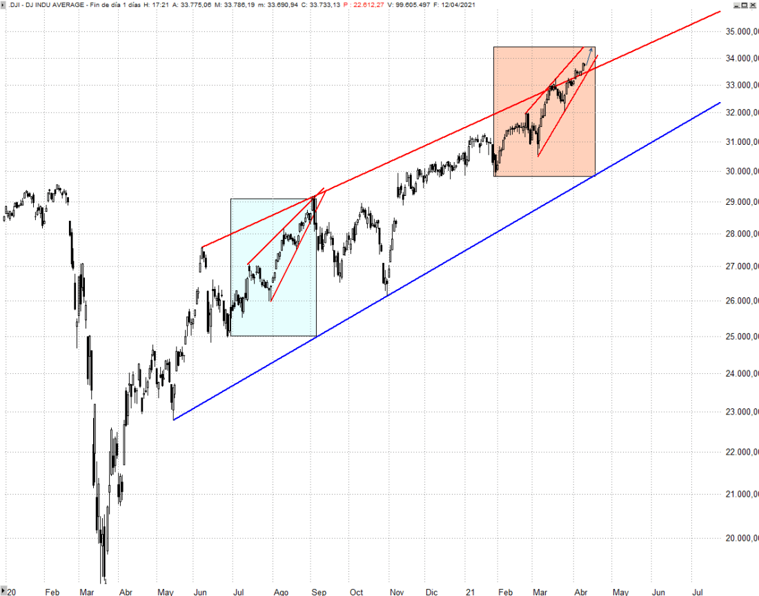 Seguimos pendientes en Wall Street, de la consecución de nuevos máximos históricos y crecientes en el Nasdaq 100, que es lo más probable tras haber superado la zona de resistencia de los 13.300 puntos; del Dow Jones, que se aproxima a objetivos que aparecen en la zona de los 34.400 puntos a corto plazo y que podrían poner freno a las subidas, y del techo del gran canal alcista que desarrolla el S&P 500, y que mostramos en el chart semanal adjunto. En este último caso, su superación sería un grandísimo argumento de fortaleza de cara al medio y largo plazo, pero a estos niveles ya no somos partidarios de añadir más compras con vocación de permanencia sin ver una corrección significativa.