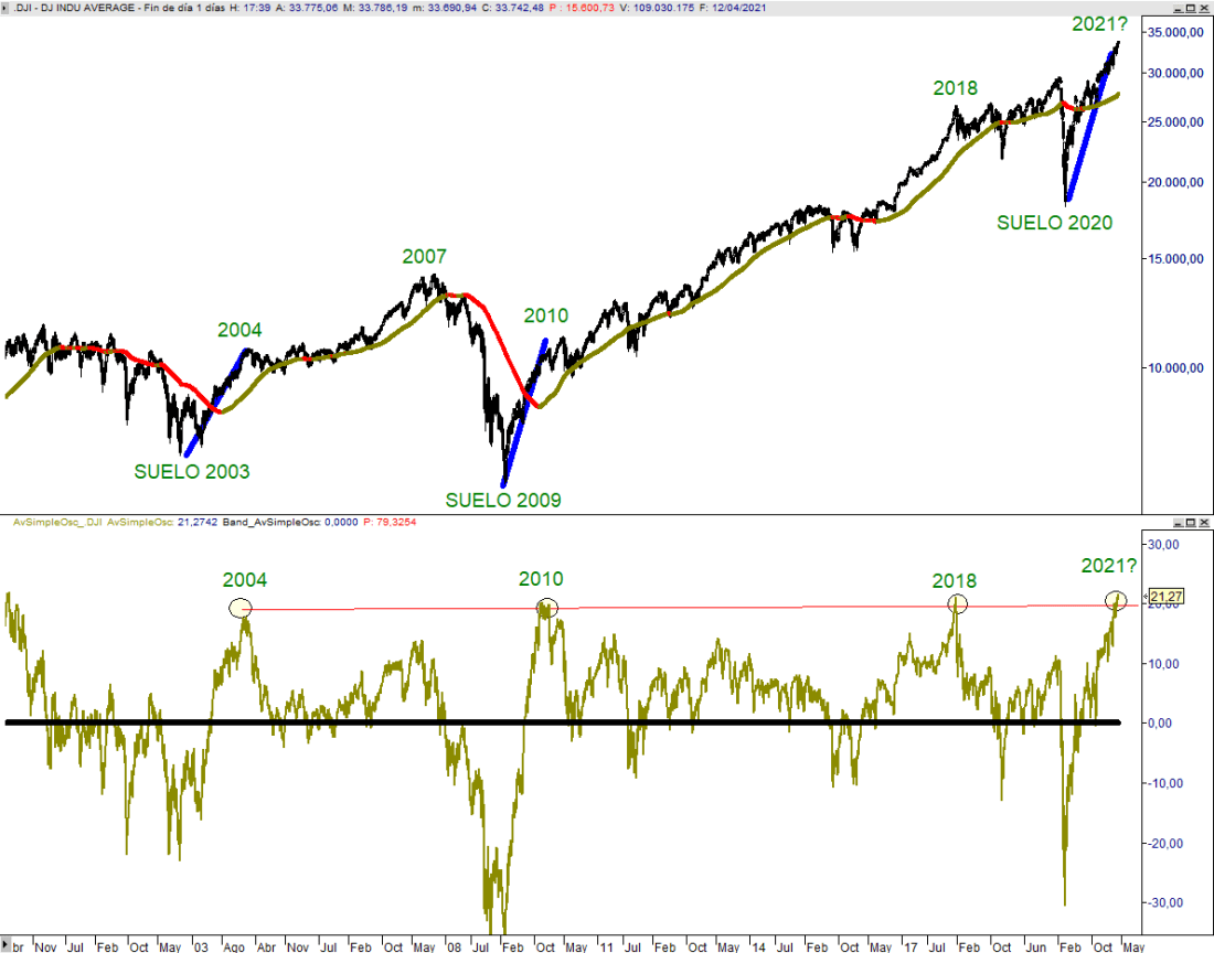 Utilizamos pocos indicadores de sobrecompra, pero atendiendo al diferencial en porcentaje del precio con respecto de su media de 275 sesiones, equivalente a 55 semanas, nos traslada también al techo relativo que formó tras el primer gran tramo alcista en 2009. En 2015 volvió a situarse prácticamente en los mismos niveles y también encontró freno. No solo eso, también encontró freno en estos niveles tras el primer gran tramo alcista del suelo de 2003. Este nivel de sobrecompra actual próximo al 20% no quiere decir que una caída sea inminente, pero invita a la prudencia, a estrechar la vigilancia sobre aquellos valores que muestra más debilidad en nuestras carteras y a no aumentar exposición de forma significativa. Esta misma sobrecompra la encontramos también en el Dow Jones Industriales y en el S&P 500, por tanto, debemos seguir siendo alcistas, pero sin entrar en fase de euforia y complacencia.