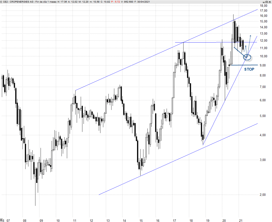Ceder los 9 euros no tendría ningún sentido y no encajaría con su reanudación alcista en subida libre. El próximo objetivo destacable a plazos largos aparece sobre los 17,85 euros, un potencial de revalorización superior al 80%, cuyo alcance lógicamente podría llevar su tiempo y supondría presionar el techo del canal ascendente que mostramos en el chart mensual adjunto. Su superación situaría su cotización definitivamente en subida libre absoluta.