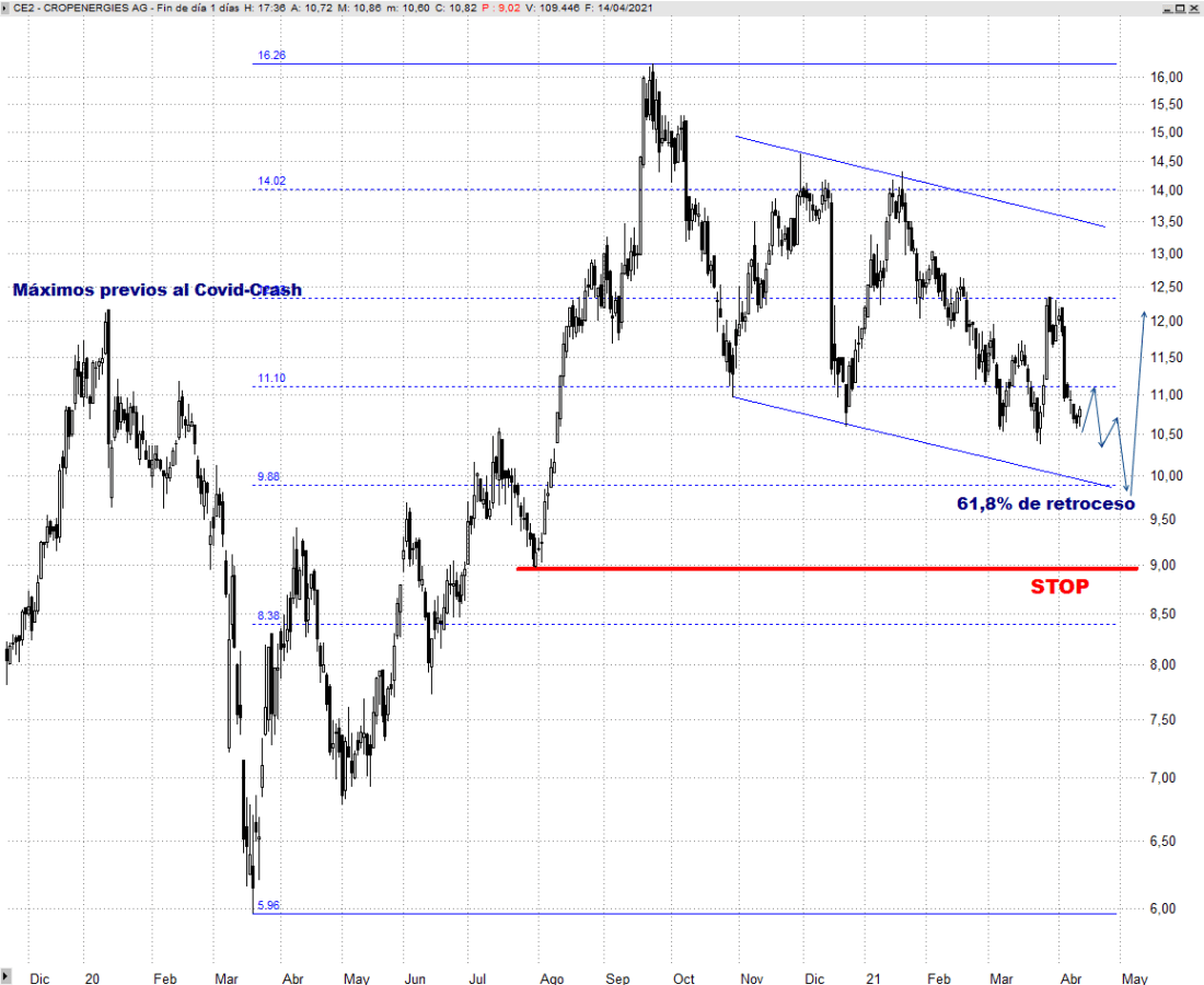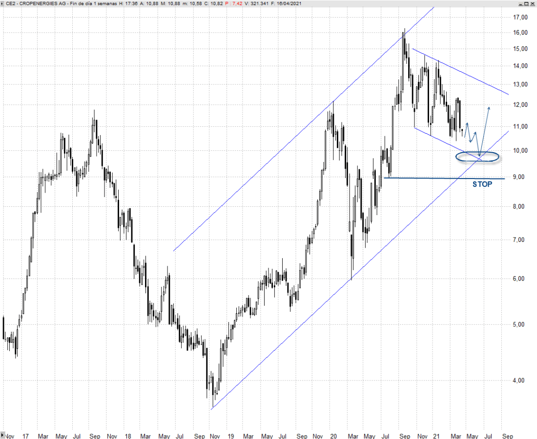 En el más corto plazo aún podríamos ver una recaída hacia la zona de los 9,90/9,70 euros, por donde convergen dos directrices que refuerzan ese entorno como soporte, tal y como mostramos en el chart semanal adjunto. Su alcance nos ofrecería una atractiva oportunidad de incorporación con stop ajustado bajo los 9 euros. Si cumple con el escenario planteado debemos de ser conscientes de que todavía podría consumir más tiempo en lateral por debajo de los 13 euros desarrollando vaivenes, pero mientras resista sobre este entorno su resolución al alza será lo más probable.