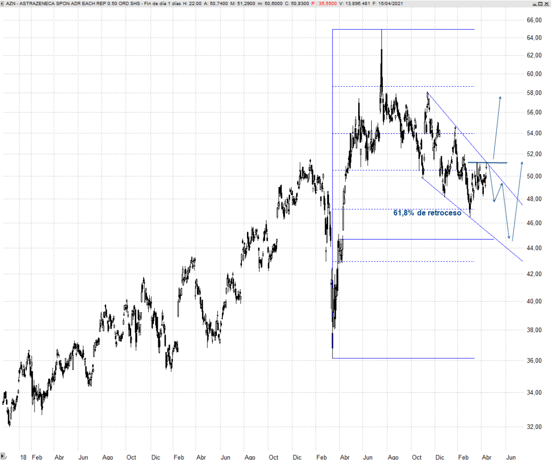 Astrazeneca, envuelta en las últimas semanas en incertidumbre por la aparición de casos de trombos al aplicar su vacuna, quiere retomar las subidas en bolsa después de corregir buena parte del movimiento alcista originado en marzo del pasado año. Su cotización en el Nasdaq abrió ayer un hueco para presionar primeras resistencias, cuya superación favorecería la reanudación de su tendencia a pesar de que Dinamarca se convirtió el miércoles en el primer país del mundo en descartar por completo el uso su vacuna en la lucha contra el Covid-19.