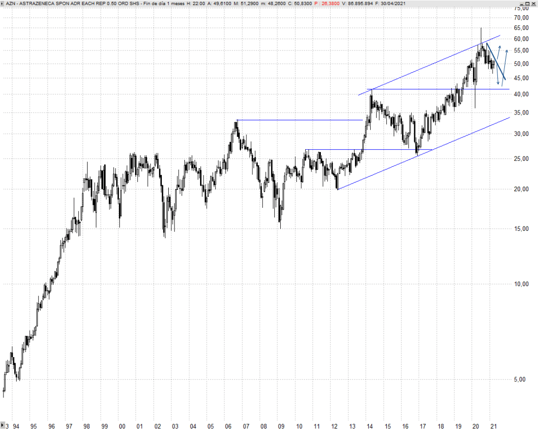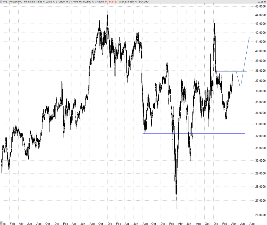 Pfizer ha corregido prácticamente toda la subida originada a finales de octubre y si supera los citados 37,85 dólares reforzaría en gran medida los 33 dólares como soporte fundamental de largo plazo. Si ampliamos las miras podemos intuir la formación de un patrón gigante en forma de cabeza y hombros invertido, y otro a su vez en los últimos años. Su confirmación sobre los máximos históricos de finales de los años 90 plantearía objetivos muy ambiciosos, pero tampoco debemos vender la piel antes de cazar al oso.