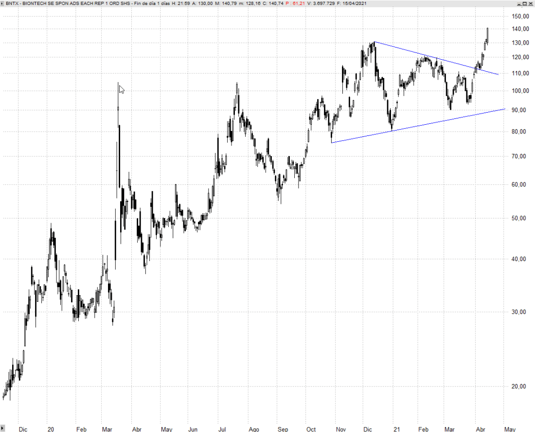 Pfizer y BionTech, su socio alemán en la producción de las vacunas, están registrando subidas en su cotización en las últimas sesiones. BionTech se ha disparado tras superar su última fase consolidativa y no mostrará debilidad mientras no pierda los 118 dólares. Pfizer, si supera a cierre semanal los 37,85 dólares daría un gran paso para volver a presionar sus máximos históricos.