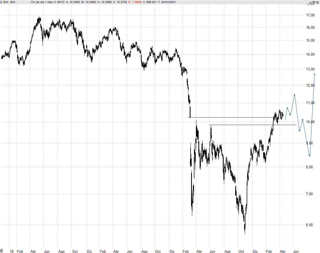 La italiana Eni sufrió un duro desplome el pasado año que le está costando recuperar. Lo más destacable en las últimas semanas desde el punto de vista técnico es que ha logrado marcar máximos crecientes sobre los 10 euros cerrando el hueco bajista que abrió en pleno Covid-Crash desde los 10,23 euros.