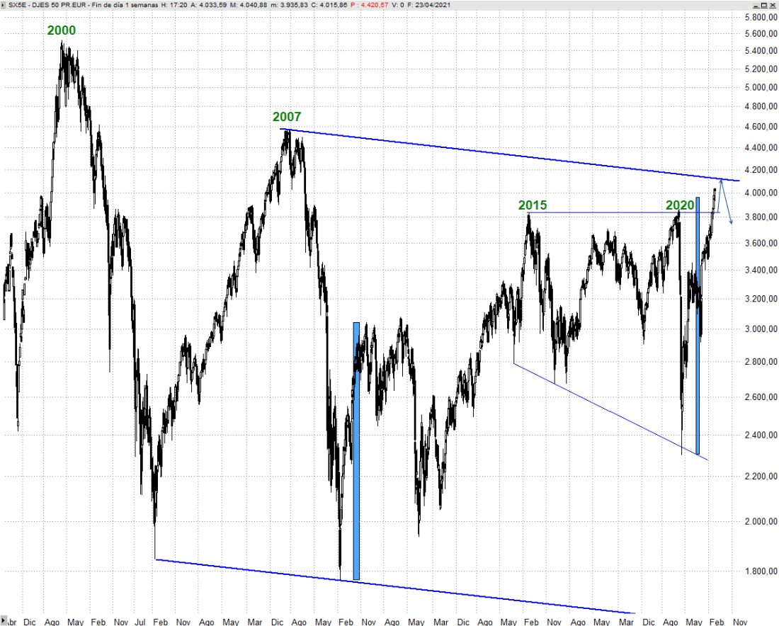 Todavía es probable que asistamos a una consolidación mayor a corto plazo, pero no hablamos de techo en la subida. No nos sorprendería que una vez que finalice esta fase consolidativa veamos nuevos máximos crecientes que podrían dirigirse hacia los reiterados 4.095 puntos del Eurostoxx 50, por donde discurre el techo del amplio canal lateral que mostramos en el chart semanal adjunto.