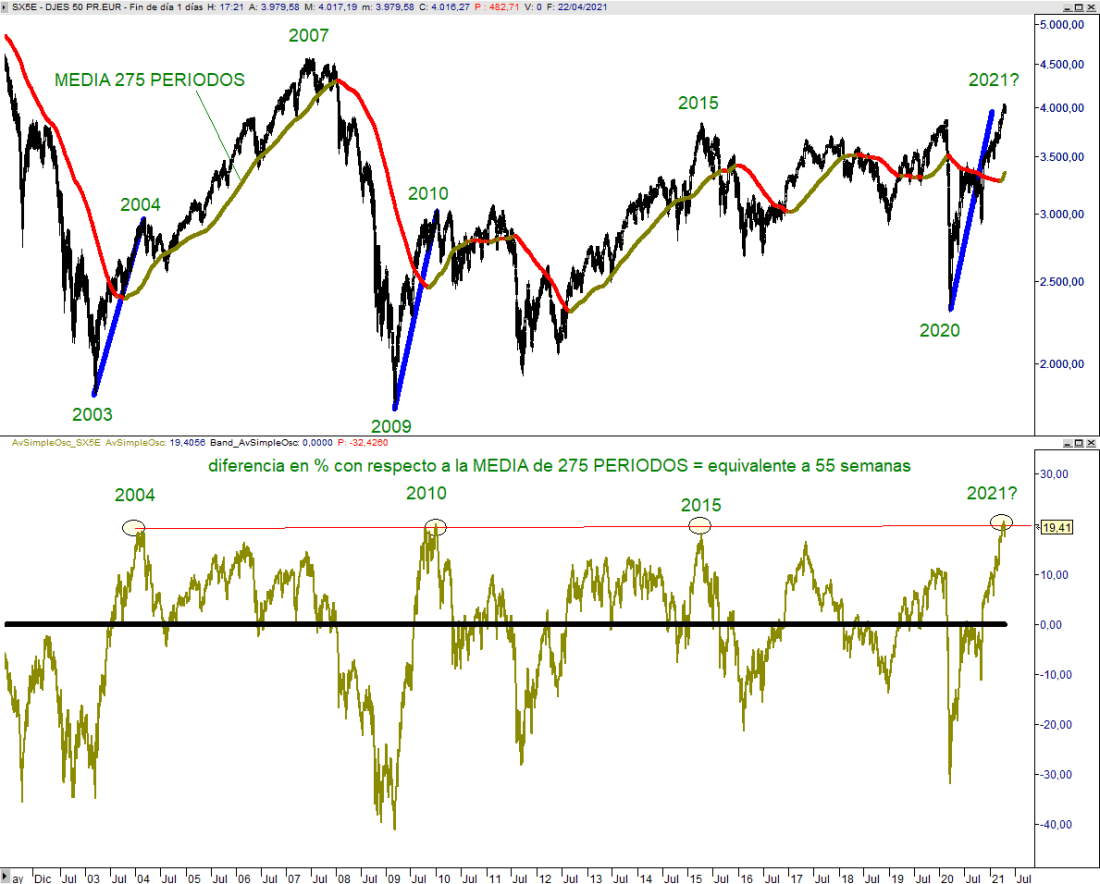 Con la actual sobrecompra en los índices a ambos lados del Atlántico no debe de sorprendernos que aparezcan dificultades, puesto que estamos en niveles muy pocas veces vistos en los últimos 20 años. Para encontrar una sobrecompra mayor en Wall Street debemos ir a finales de los años 90, antes de la explosión de la burbuja tecnológica del año 2000. No es la misma situación, puesto que podríamos estar ante los comienzos de un nuevo ciclo alcista duradero por varios años, tal y como sucedió tras el suelo del año 2009, pero si es un nivel de sobrecompra que advierte de que va a ser complicado mantener el ritmo de subida.