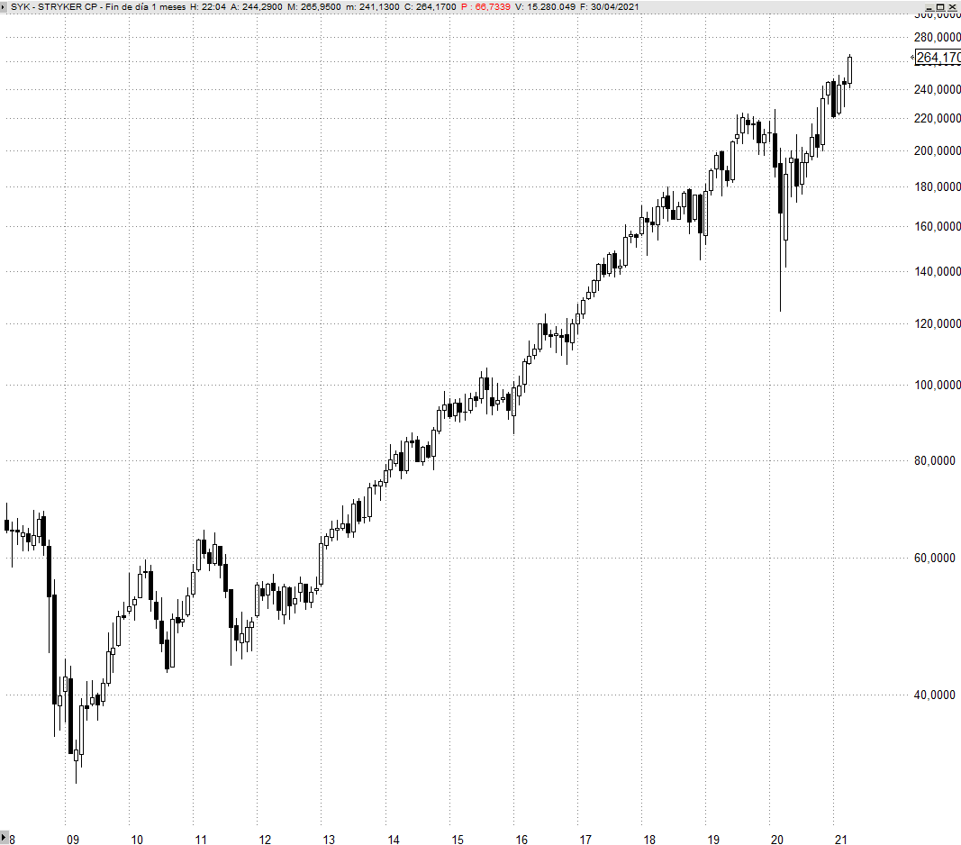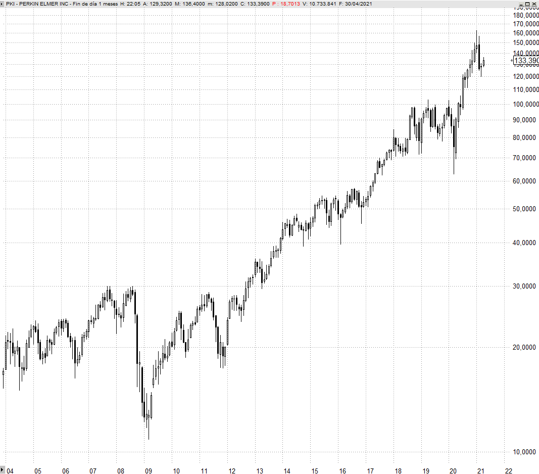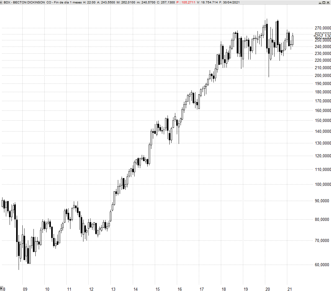 Títulos del sector con los que también compite y tienen una envidiable fortaleza son Thermo Fisher Scientific $TMO, Becton, Dickinson and Company $BDX, Stryker Corporation $SYK y PerkinElmer $PKI. Todos ellos son potenciales compras una vez que se alivie de forma generalizada la sobrecompra en las bolsas, por tanto, son valores a vigilar susceptibles de incorporación a cartera con vocación de permanencia a plazos largos con el objetivo de exprimir su tendencia en subida libre absoluta, que es la situación técnica más alcista que existe.